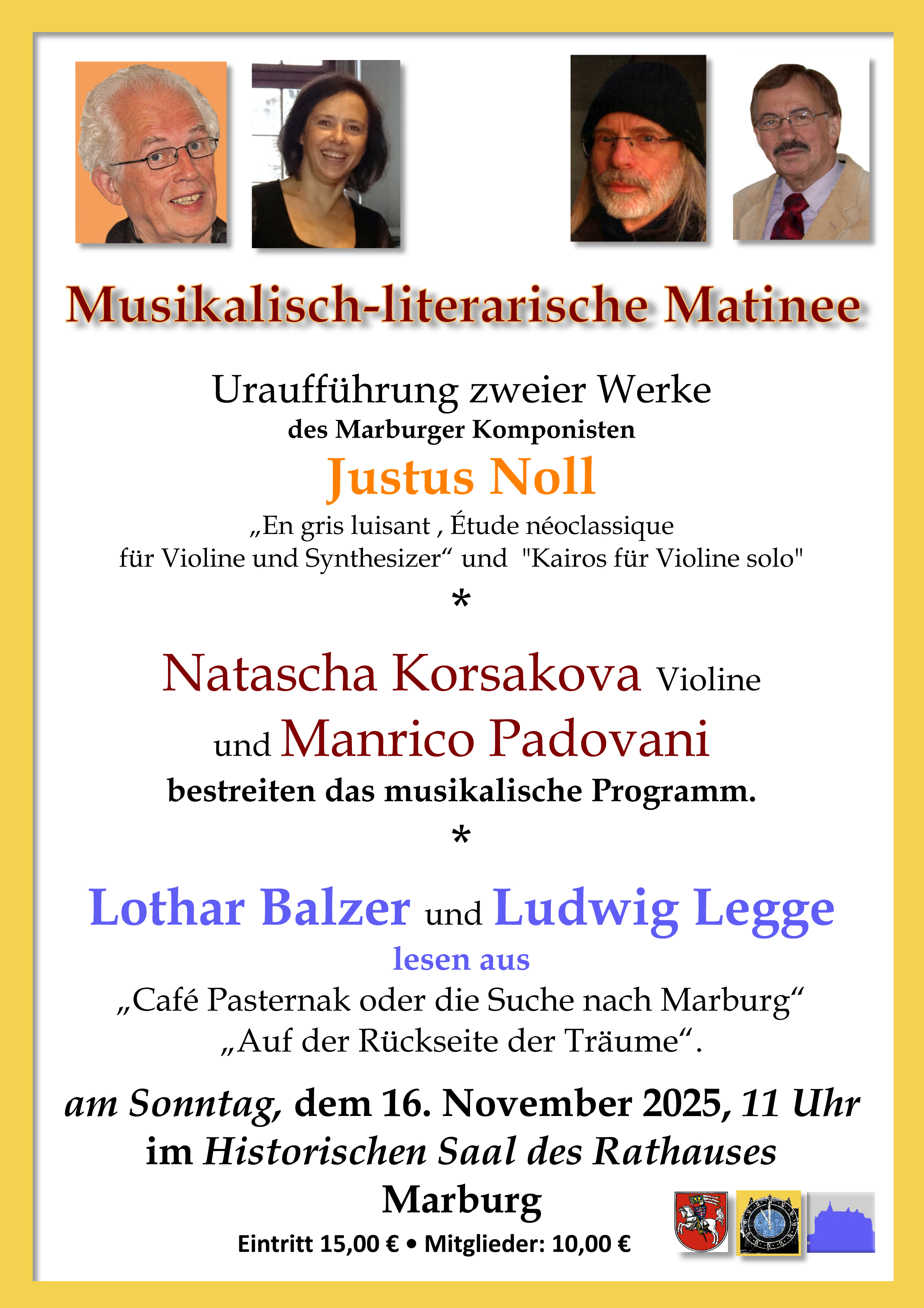 Dazwischen gibt es literarische Kurzbeiträge mit Lothar Balzer, der Gedichte aus seinem Zyklus „Café Pasternak oder die Suche nach Marburg“ lesen wird und Ludwig Legge mit Gedichten aus seinem Band „Auf der Rückseite der Träume“.