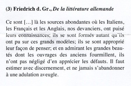 Ein weiterer Verweis: „Von den alten Dichtern ist es Horaz, mit dem Friedrich der Große die meiste Verwandtschaft hat. Viele seiner Gedichte bewegen sich in ähnlichen Richtungen und Formen wie die Horazischen Satiren und Briefe und vertragen es wohl mit diesen verglichen zu werden."