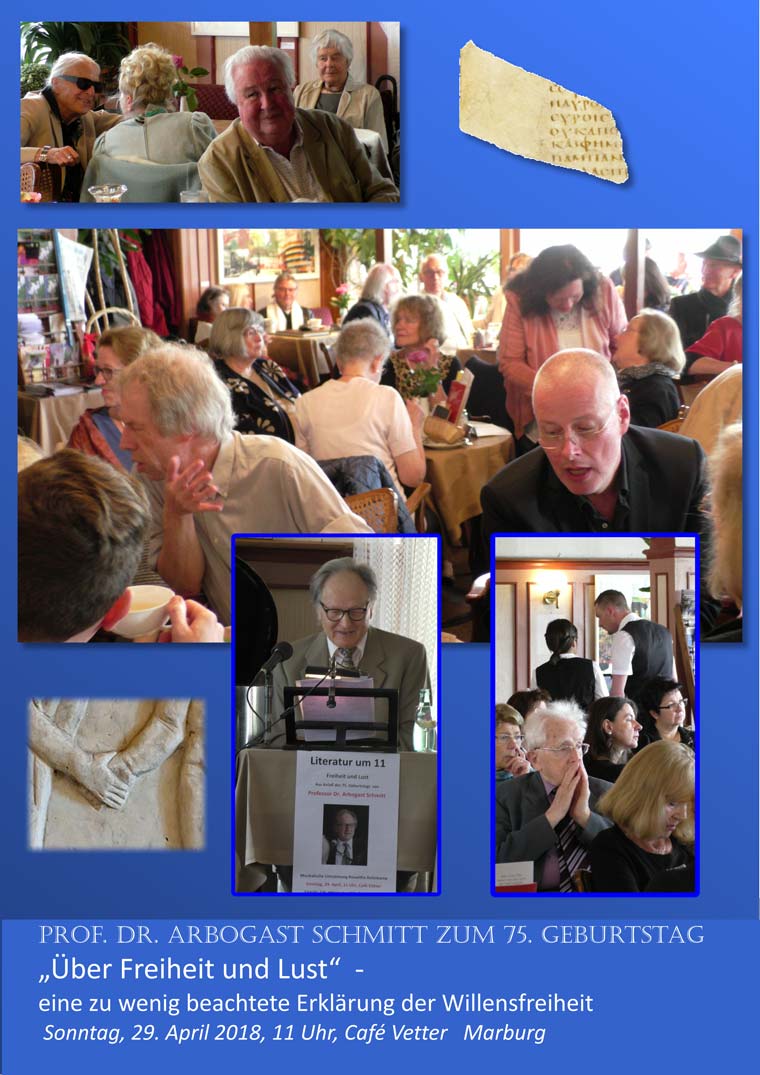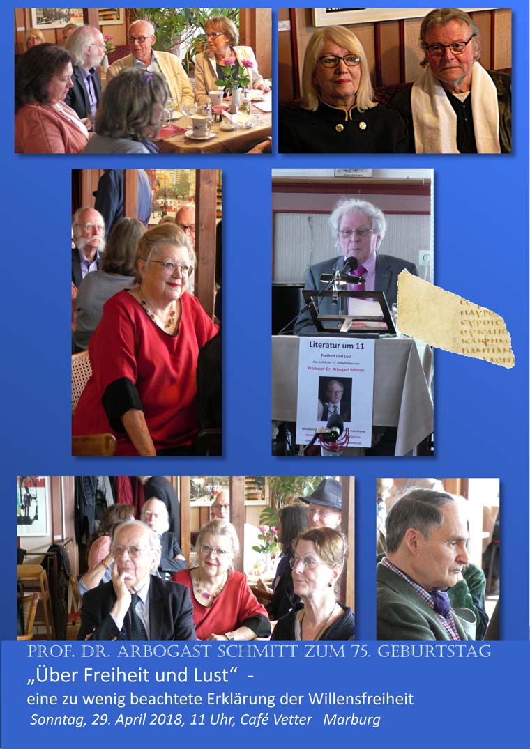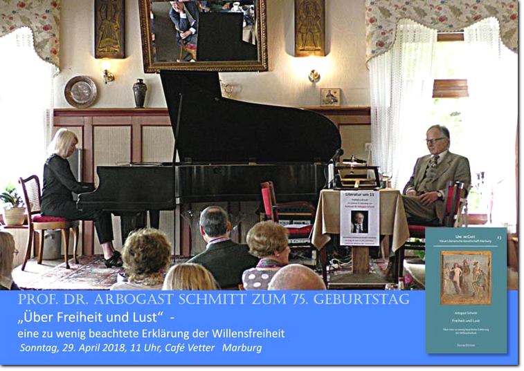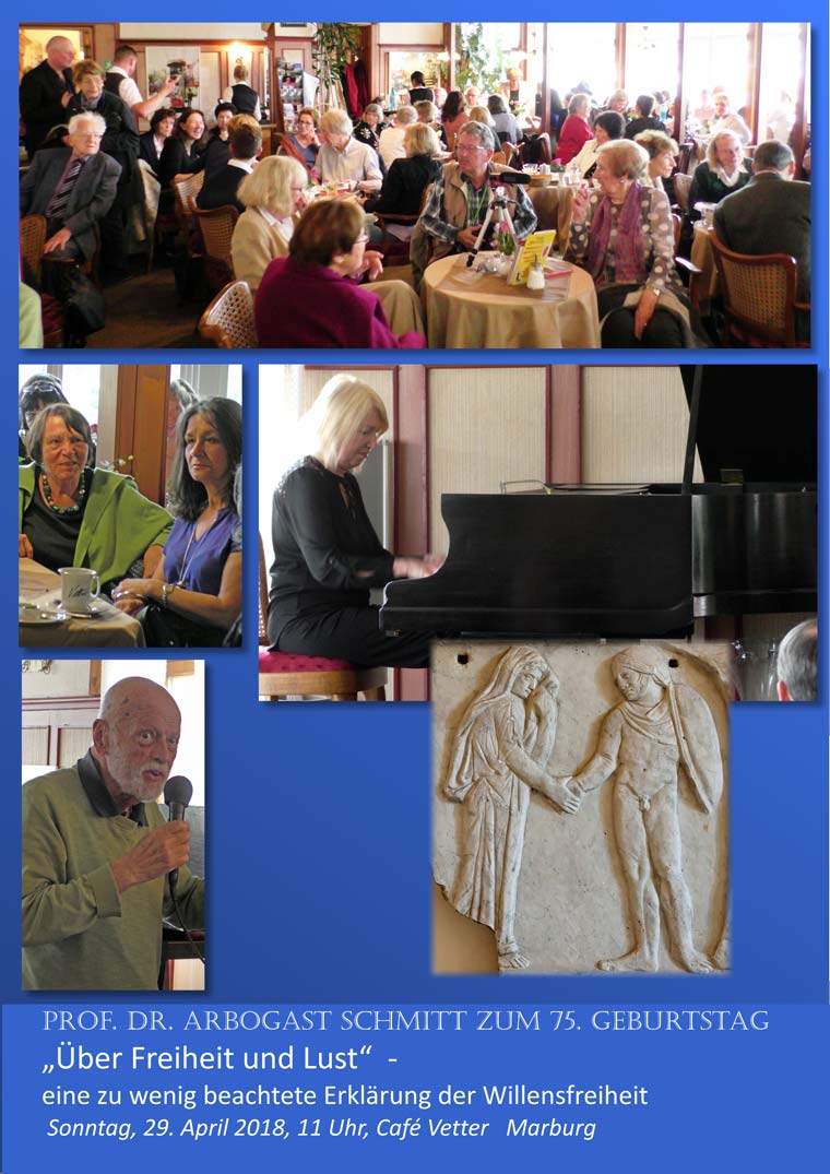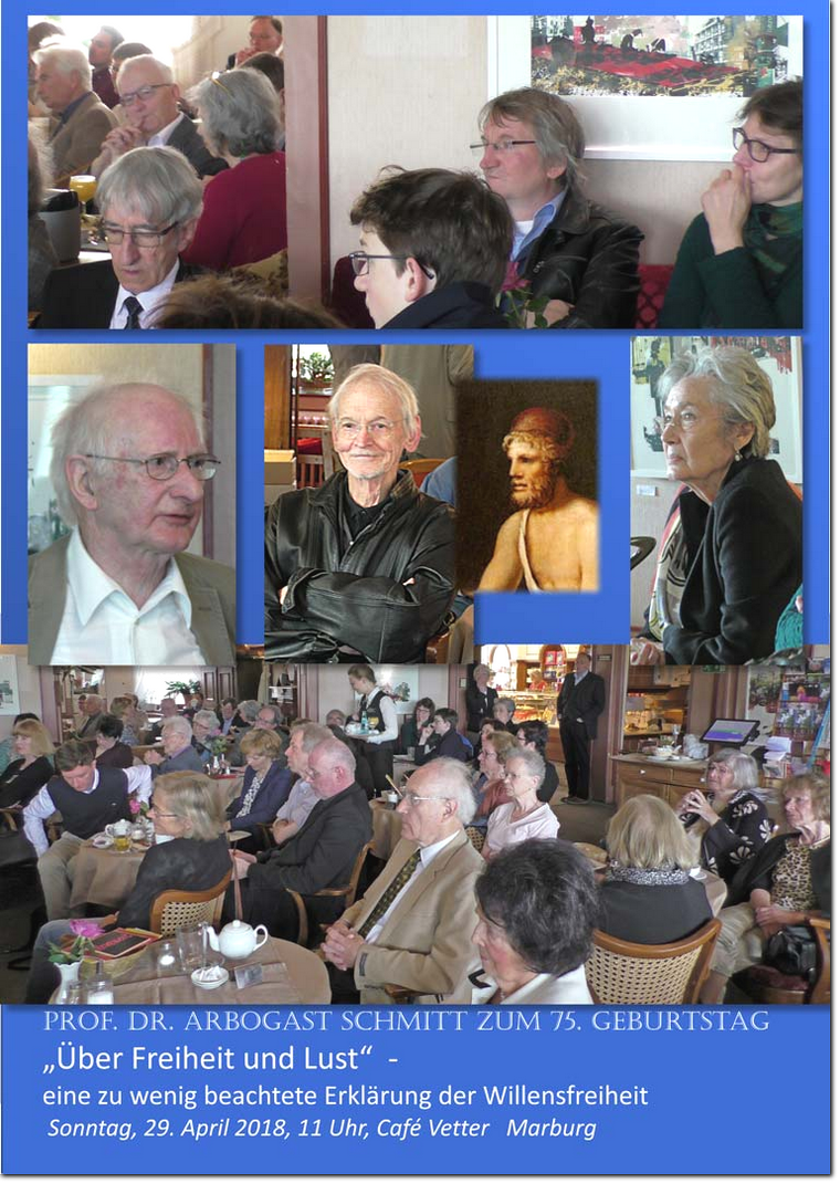 Meine Damen und Herren, Professor Horst Schwebel, der sich sehr gut im Werk von Arbogast Schmitt auskennt, auch mit den beiden Schutzheiligen Aristoteles und Platon, wird jetzt eine Einführung geben. Ich wünsche Ihnen einen sehr anregenden Vormittag, denn Freiheit und Lust, wer dächte nicht gelegentlich darüber nach.“